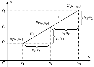 Belli oranda bölen noktayı bulurken; verilen oranlar ile apsisler farkı ve ordinatlar farkı arasında benzerlikten kaynaklanan bir eşitlik oluşur. A(x1,y1) , B(x2,y2) ve C(x3,y3) noktaları için,
